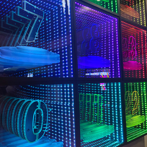 กระจก3D หลายชั้นลายก้นบึ้งของตกแต่งโลโก้นีออนรูปตัวอักษรหลากสีพันชั้นสุดมหัศจรรย์